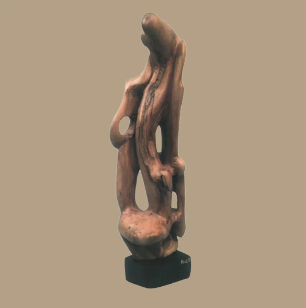 Hevzi Nuhiu scolpisce il corpo con tratti nervosi ed essenziali, lasciando che la materia suggerisca il movimento, la tensione, il vuoto tra terra e cielo. L’opera è espressione del suo linguaggio poetico e minimale, dove ogni curva, taglio e venatura contribuisce alla narrazione silenziosa.