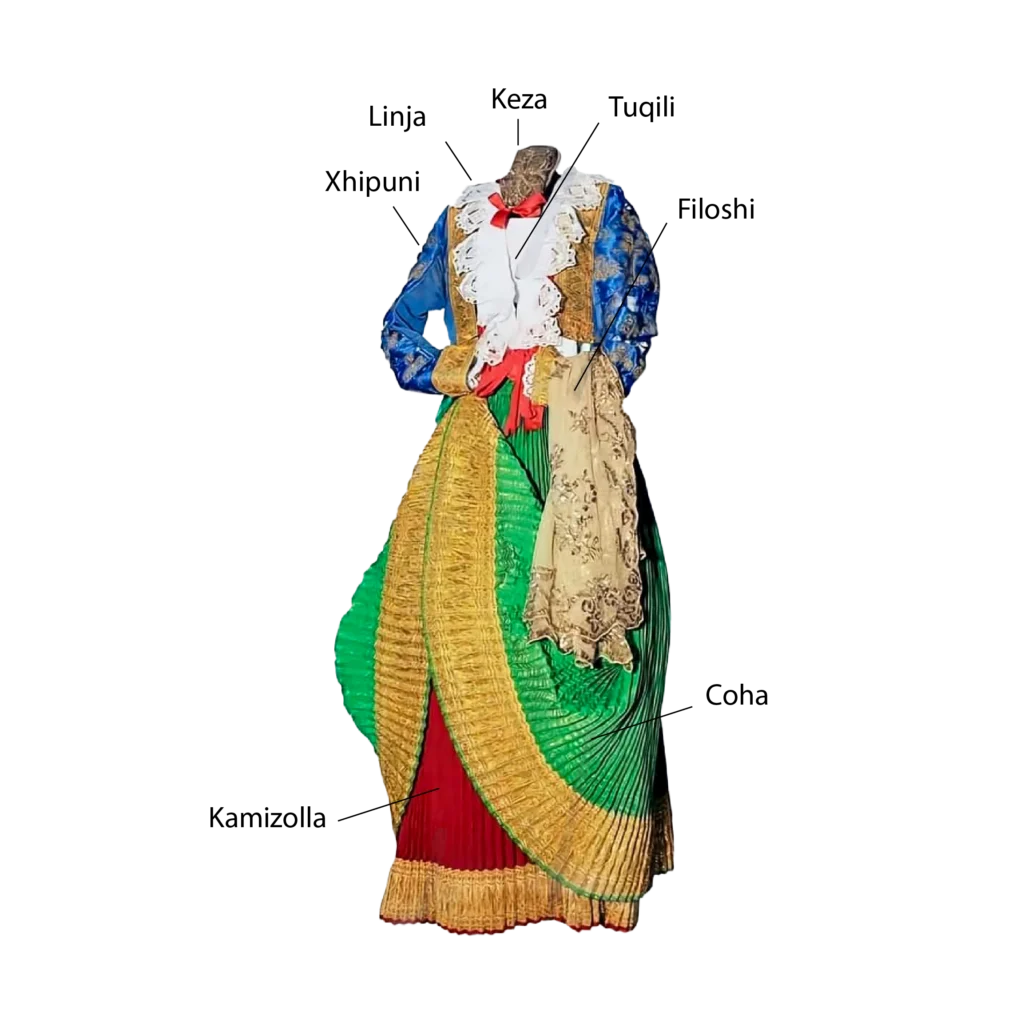 Xhipuni – cortissimo corpetto simile al colore della coha, con lembi gallonati in oro e con larghe fasce di galloni d’oro nella parte posteriore delle spalle. Le maniche presentano finissimi ricami dorati che richiamano motivi floreali o astrali.
