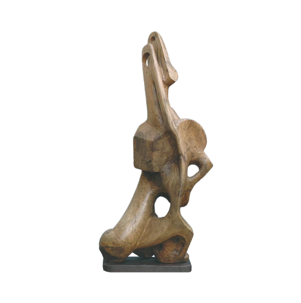 Scultura astratta in legno d’ulivo. Composizione verticale realizzata con pieni e vuoti che simboleggiano forza, fragilità e resistenza.