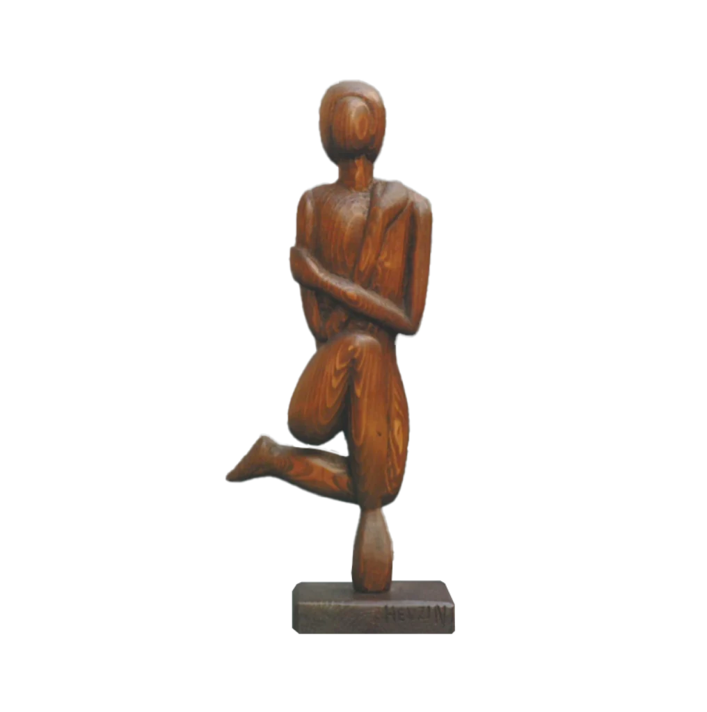 Scultura in pino silano. Figura in equilibrio su un piede, realizzata con venature leggere che accompagnano la tensione verticale del corpo.