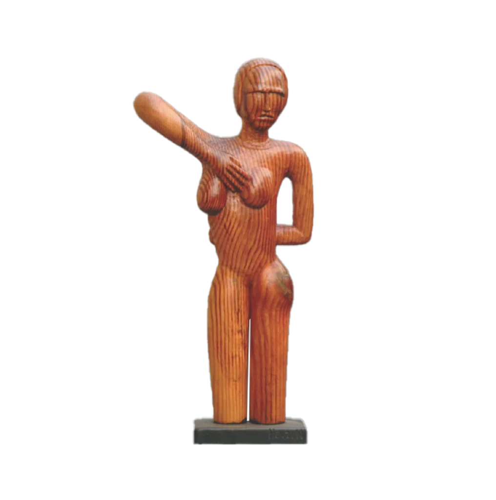 Inposa, il corpo femminile si fa tempo sospeso, gesto che trattiene il respiro. La figura, scolpita nel pino silano, appare raccolta, come in un momento di concentrazione o abbandono meditativo. È una “posa” che non mostra, ma rivela: non si espone, ma si offre allo sguardo con pudore e profondità.
