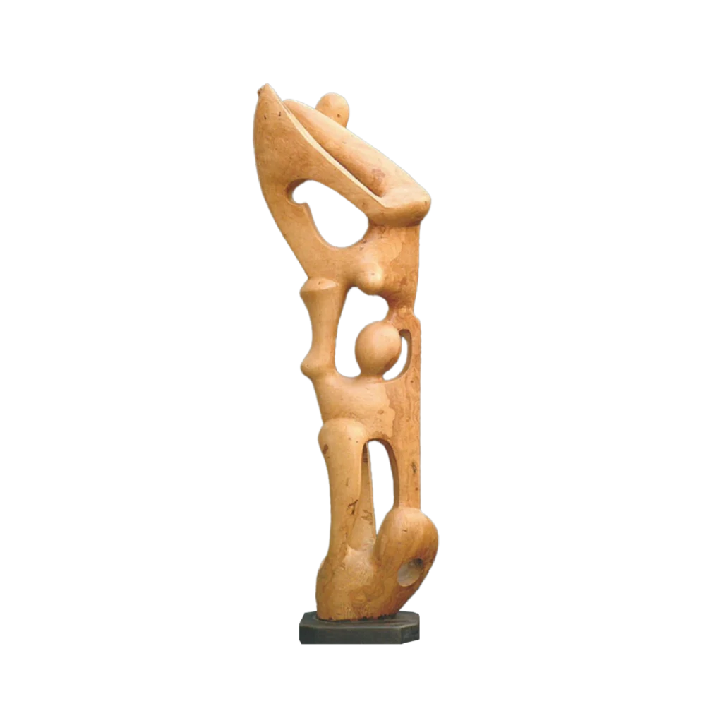 Scultura in legno d’ulivo, lavorata con tagli profondi e torsioni verticali. L’opera esprime la condizione umana attraverso forme compresse e venature irregolari.
