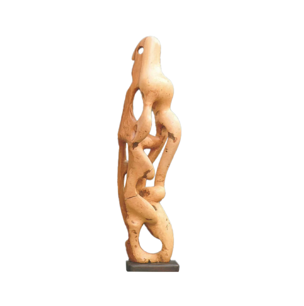L’isola di Pasqua, realizzata nel 1997, è un omaggio alle iconiche sculture Moai che Hevzi reinterpreta attraverso l’intaglio diretto su legno d’ulivo, materiale ricco di simbolismi nel contesto mediterraneo. La scultura, alta 100 cm, assume una forma totemica, verticale, essenziale e solenne.